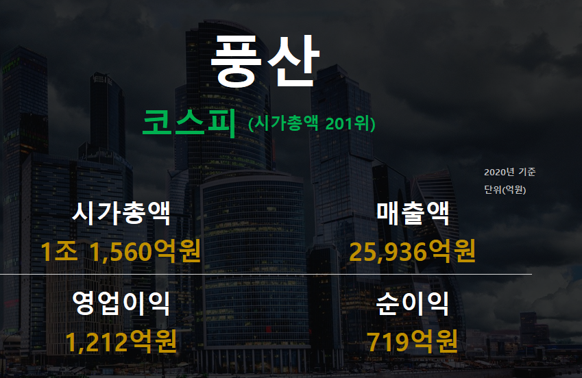 풍산은 신동제품을 제조, 가공해서 판매하는데 원자재 가격이 오르면 판매 가격에 바로 반영할 수 있어 앞으로 실적이 향상될걸 로 기대가 됩니다.