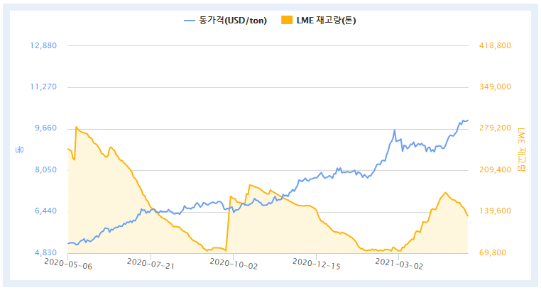국제광물시세에서 1년간의 동의 가격그래프를 보면 LME(런던금속거래서) 재고량이 하락추세로 재고량이 빠르게 소진되는걸로 보아 동의 수요가 많다는 증거이며 재고감소,수요증가로 동의 가격은 10년 만에 최고가를 기록하고 있습니다.