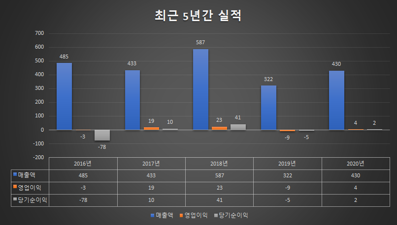 CS의 최근 5년간 매출액을 보면 2018년도에 587억원 최고 매출을 기록하고 2019년도에는 -45.1% 감소한 322억원을 기록하며 매출이 큰폭으로 감사하였다가 2020년도에는 다행이 상승전환하여 매출액 430억원으로 33.5% 상승하였습니다.