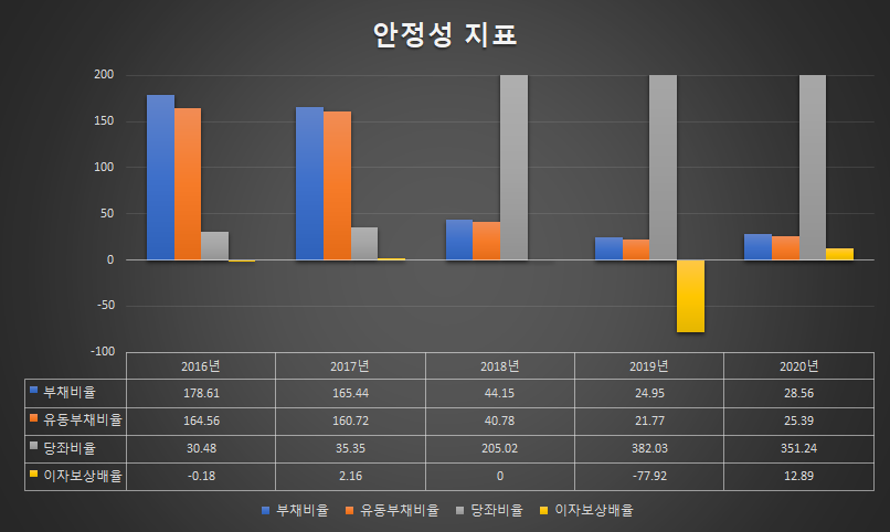 부채비율 감소추이 : 2017년 165.44%, 2018년 44.15%, 2019년 24.95, 2020년 28.56%