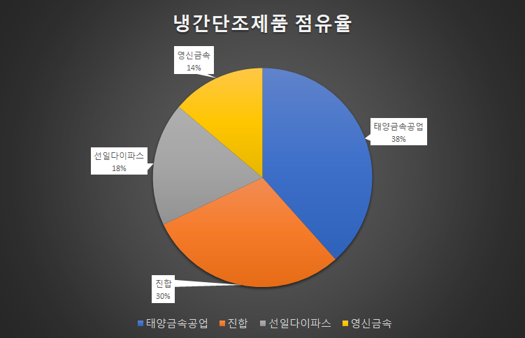 태양금속의 주력제품인 자동동차용 볼트, 너트류를 제조하는 업체는 한국파스터공업협동조합 등록 기업 71개와 등록되지 않은 중소규모 기업이 집계가 어려워 완성차업체 3사(현대, 기아, GM)에 공급하는 업체의 매출액 기준으로 시장점유율을 집계되었습니다.