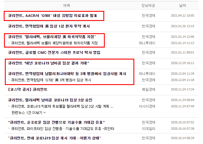 큐리언트는 한국 파스퇴르연구소에서 분사해 설립된 의약품 연구개발전문업체로 2021년 주요 임상내용은 막스플랑크연구소에서 도입한 CKD-7저해제 유방암 치료제 후보물질인 Q901 임상1상 진행결과를 발표했는데 유방암 종양의 성장이 현저하게 억제되는 결과를 보였다고 합니다.