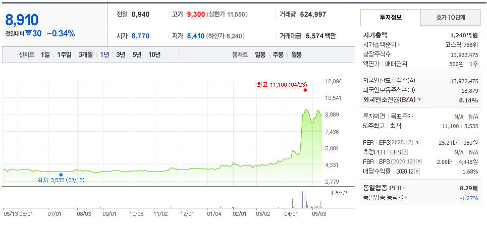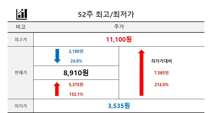 희림의 주가는 최근들어 급등을 하여 52주 최저가 3,535원 대비 152% 올라 현재가 8,910원을 기록중이며 한때 최저가대비 214%까지 상승하여 최고가 7,565원을 기록하였습니다.