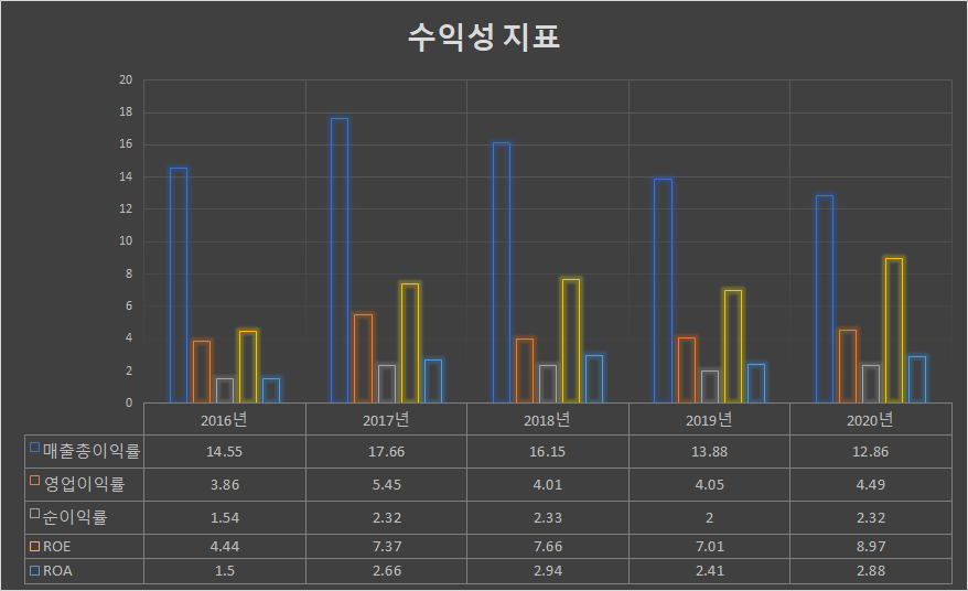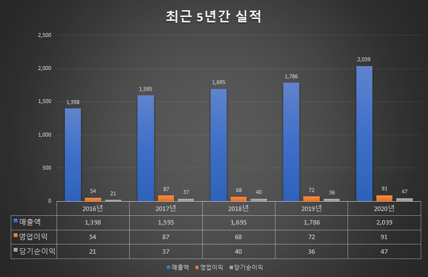 영업이익과 당기순이익 또한 매년 지속적으로 상승하여 안정적인 이익을 내는 모습입니다.