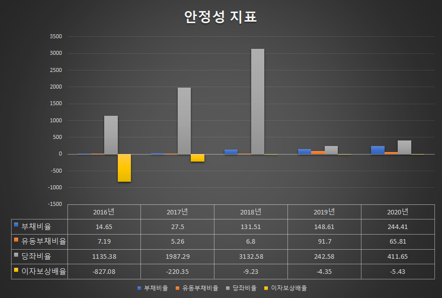 아이진의 부채비율은 2016년 15%를 시작으로 꾸준히 증가하여 2020년 244%를 기록하며 부채가 자본보다 많은 비율을 차지하고 있으며 유동부채비율은 2019년 대비 28% 감소하여 65.81%를 기록하고 있습니다.