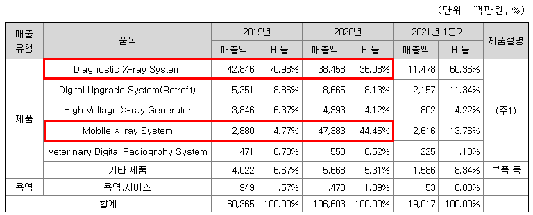 디알젬의 주요제품 매출 현황을 보면 Diagnostic X-ray System(아날로그 엑스선 촬영장치)의 2019년 매출비중이 71%에서 2020년 36%로 감소하고 Mobile X-ray System(이동형 영상진단장치)의 매출비중이 2019년 4.8%에서 2020년 44%로 증가하여 Mobile X-ray System의 수요가 증가하는걸로 판단이 되나 2021년 1분기 매출비중은 Diagnostic X-ray System의 매출비중이 가장높은 60%로 나왔습니다.