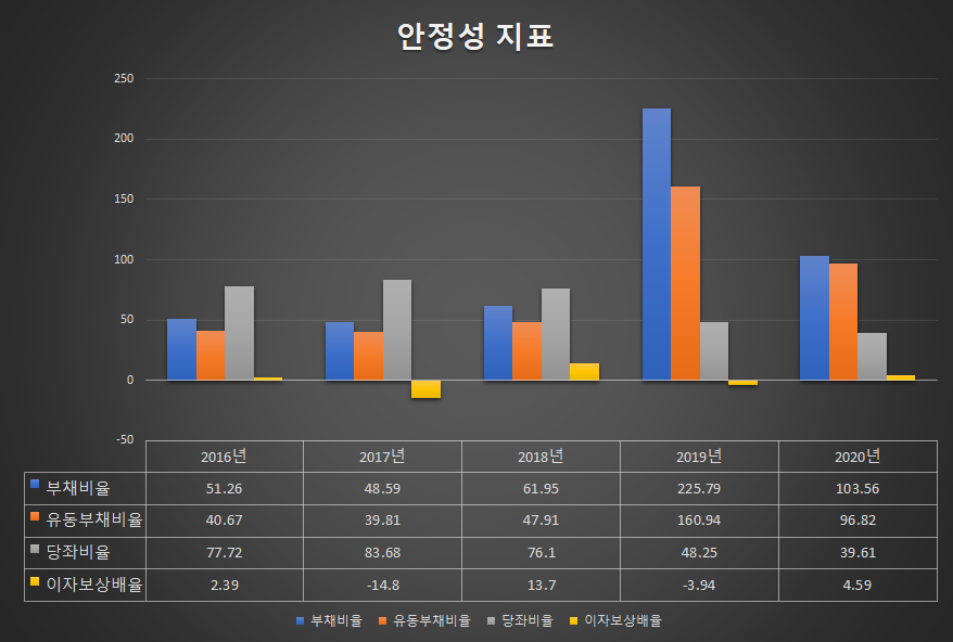 한양디지텍의 부채비율 2019년에 226%로 큰폭으로 증가하였으나 2020년에 104%로 많이 낮아졌으나 부채가 자본보다 많은 상태라 좀더 낮아질 필요가 있어보입니다.