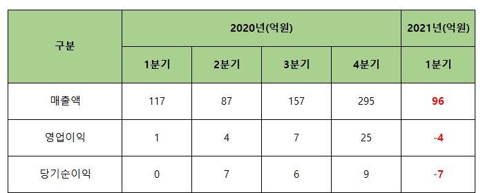 매출액은 96억원으로 전년동기 대비 21억이 감소하여 감소율 17.9%를 기록하였고 영업이익은 -4억원으로 적자를 기록하였으며 당기순이익 또한 -7억원 적자를 기록하였습니다.