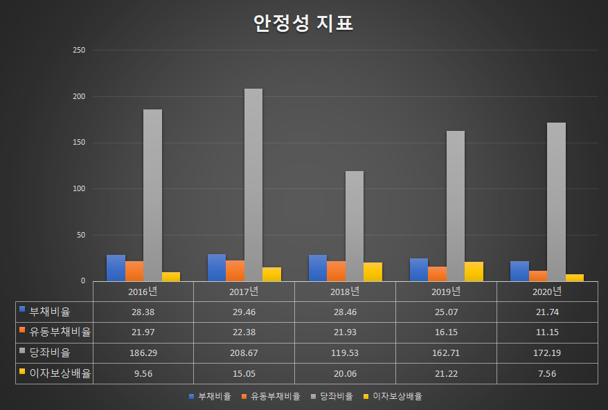 당좌비율 172.19% 2년연속 증가, 이자보상배율 7.56% 전년대비 -64.4% 감소하였습니다.