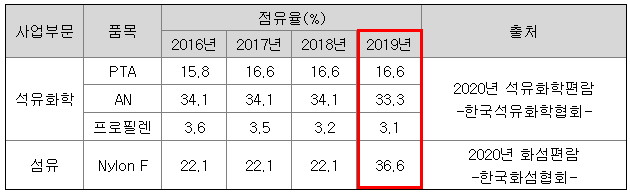 제품별 시장상황으로, PTA는 폴리에스테르 섬유, PET Bottle 및 PET Film의 기초 원료로 사용되고 있으며, PTA산업은 대규모 설비투자가 소요되는 자본 및 기술집약적 장치산업으로, 세계경기 및 수급에 따라 호ㆍ불황이 반복되는 경기순환형 산업이라는 특성을 가지고 있습니다. 중국, 인도 등 신흥국들의 소득 수준 증가로 인해 수요는 향후 지속적으로 증가될 것으로 예상되나, 중국의 신증설에 따른 추가 물량 유입과 코로나19 재확산 및 미중 무역분쟁등 거시경제 불확실 요인 증가로 수익성 확보가 어려운 상황이 지속될 것으로 예상됩니다.