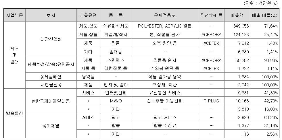 태광산업은 제조 및 임대부문은 1950년 창업 이래 내실경영을 바탕으로 품질 및 설비 우위를 통한 경쟁력을 확보하는 한편 PTA, 프로필렌, AN 등 석유화학공장 가동을 통해 수직계열화를 구축하며 업계를 선도하는 기업으로서의 위상을 굳건히 하고 있습니다.