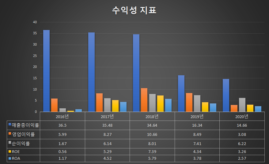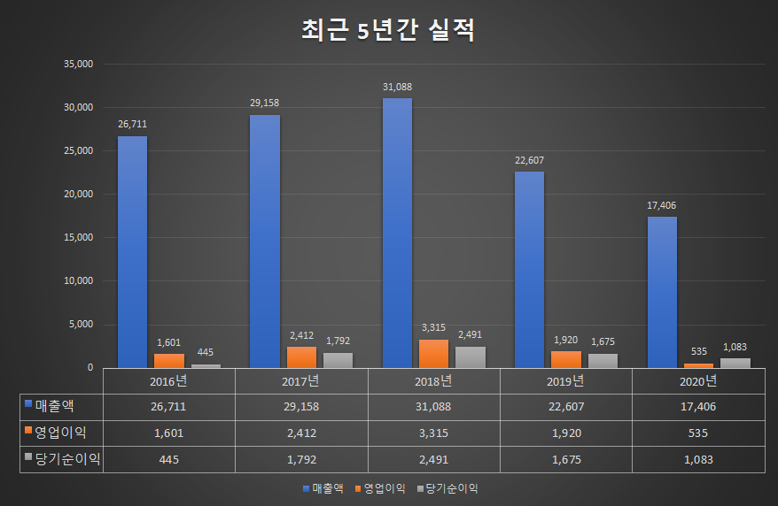 영업이익은 2019년 1,920억원을 기록한후 2020년 535억원으로 1,385억원(72%) 감소하여 큰폭의 하락을 하였고 당기순이익 또한 2019년 1,675억원에서 2020년 1,083억원으로 전년대비 35% 감소하였습니다.