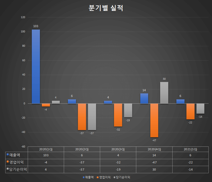 - 매출액 : 6억원 (전년동기 103억원)