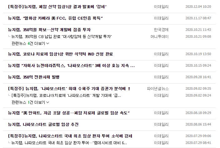뉴젠테라퓨틱스(주)는 2020년 8월에 설립되었으며, 나파모스타트를 가지고 코로나19바이러스 치료제 개발 및 임상을 진행하고 있습니다. 뉴지랩(주)의 100% 자회사이며, 임상과 약물제조, 마케팅 활동 등을 수행하고 있습니다.