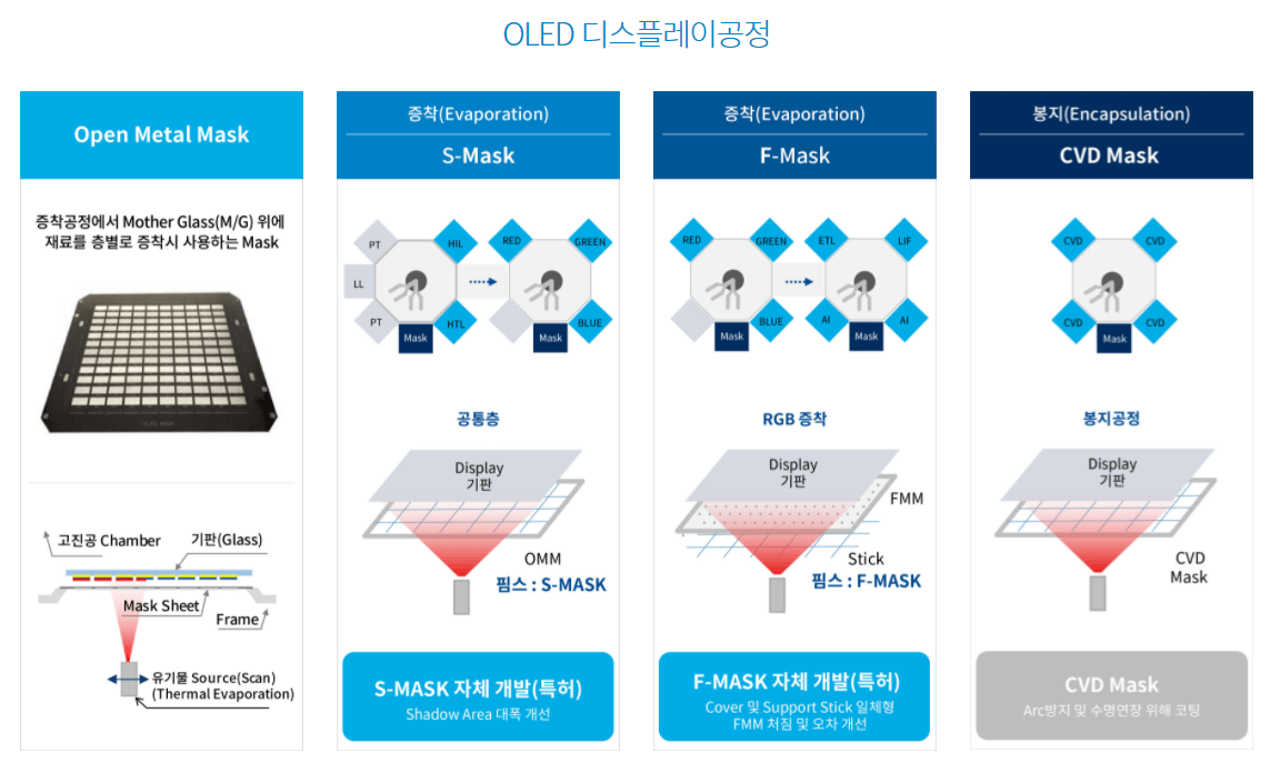 OLED 디스플레이는 TFT소자, 유기재료, 봉지층, 커버 윈도우 등 여러 층으로 구성되어 있으며, 이 중 RGB 유기재료로 구성되는 발광층(EML) 및 나머지 층(HIL, HTL 등)들을 증착하고 형성하는데 OLED 디스플레이 메탈 마스크가 사용됩니다.