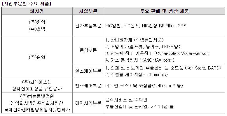 원익은 전략적인 영업단위인 4개의 보고 부문을 가지고 있으며, 각 영업 단위들은 서로 다른 부가가치를 생산하고 있습니다. 당사의 사업부문은 Hybrid IC, RF FILTER,GPS 등 전자통신부품, 제품을 생산, 판매하고 있는 전자부품 부문과 반도체, 조명기기 등을 수입, 판매하는 통상부문, 외과 및 비뇨기과 수술장비 등 첨단 의료 장비 수입 판매하는 헬스케어부문이 있습니다. 당사의 종속회사는 음식 서비스, 부동산임대 및 관리업, 사우나업을 영위하고 있는 레저사업 부문으로 구성되어 있습니다.