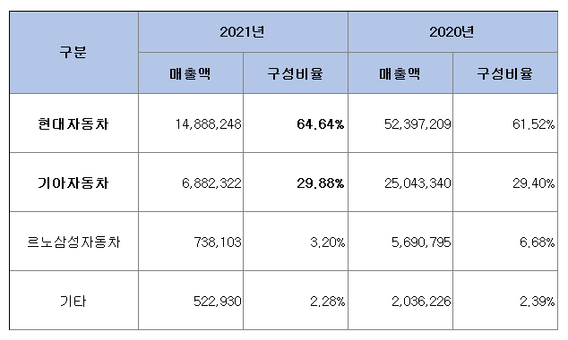최근 시트히터가 기본옵션화 되어 소비자가 선택한 차량의 등급에 따라 신차 출고 시 시트히터가 장착되면서 계절적 변동이 크게 완화되었으며 국내 주요 완성차 업체의 대부분 차종에 납품 하고 있으며 국내 시트히터 물량 90% 이상을 공급을 하고 있습니다.