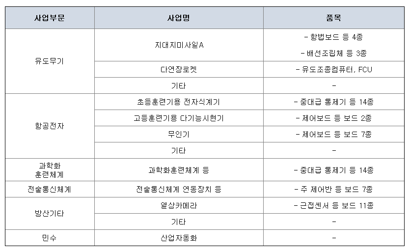 당사는 전술통신체계 연동장치의 회로카드조립체인 주 제어반 등 총 5종의 회로카드조립체와 배선장치 2종을 양산하고 있습니다.