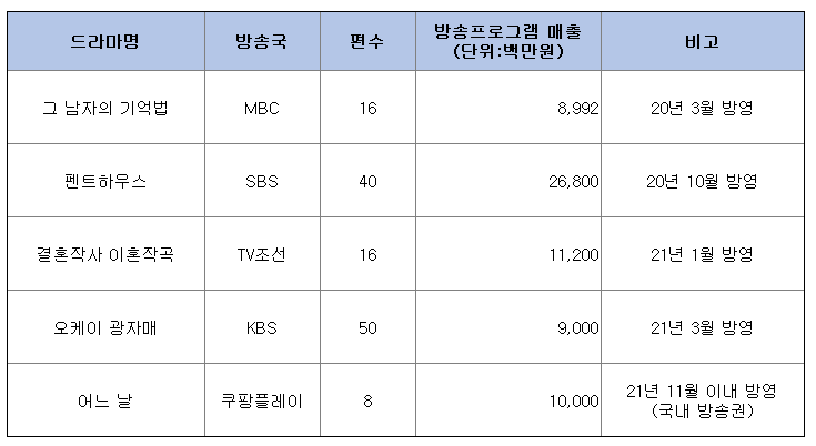 한국콘텐츠진흥원 2019년 방송영상산업백서에 따르면 2018년 방송영상 독립제작사의 총 매출 중 프로그램 제작/납품 관련 매출액은 1조 9,084억원이며 방송영상 독립제작사 영상물 제작 장르별로 매출액을 살펴보면 드라마가 1조 1,814억원입니다. 그러나 드라마 계약 금액이 대부분의 경우 비공개적이고 권리 보유에 따라 금액의 편차가 심한 경우가 많아 시장점유율을 정확히 추산하기는 어렵습니다만 전체 드라마 외주 제작 시장에서 상위 점유율을 차지할 것으로 추측됩니다.
