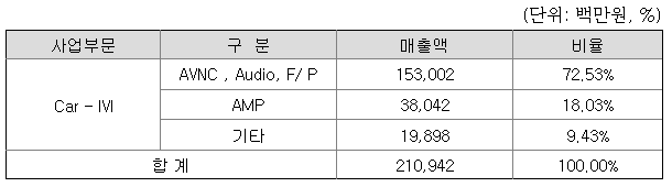 주요 품목인 카인포테인먼트 제품은 현대모비스, ALPINE, 르노삼성자동차, 한국지엠에 공급하고 있습니다.