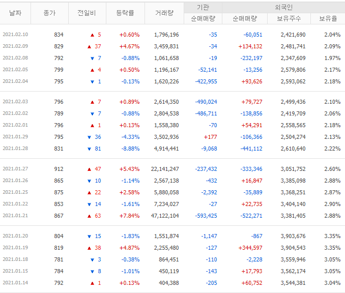 외국인의 순매수량(824,500주), 순매도량(-1,886,439주)이며 순매매량은 -1,061,939주로 외국인의 수급도 매도우위입니다. 외국인의 보유주수 및 보유율은 3,544,381주(3.04%)에서 2,421,690주(2,04%)로 1,122,691주(1%) 감소하였습니다.