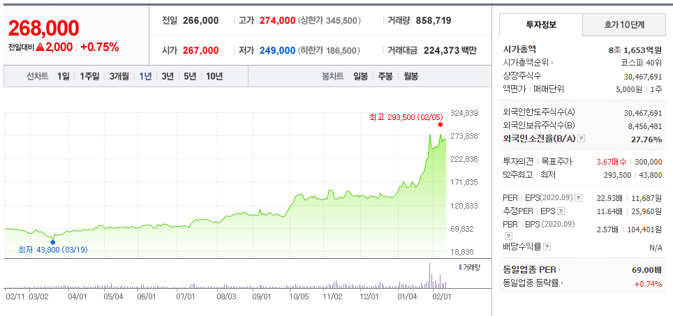 금호석유의 최근 1년차트를 보면 2월10일 현재가 268,000원으로 최근 1년중 최저가 43,800원 대비 224,200원 올라 511.9% 상승하였으며, 최고가 293,500원 대비 25,500원 내려 -9.5% 하락한 상태입니다.