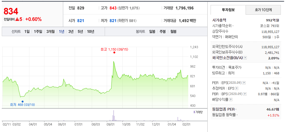 대유플러스의 최근1년차트를 보면 2월10일 현재가 834원으로 최근 1년중 최저가 468원 대비 366원 올라 78.2% 상승하였으며, 최고가 1,150원 대비 316원 내려 -37.9% 하락한 상태입니다.