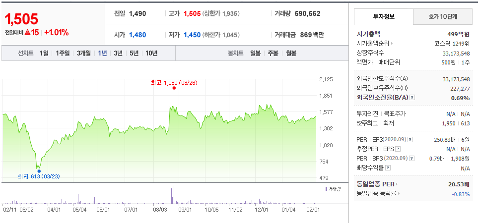 엑사이엔씨의 최근 1년차트를 보면 2월 10일 현재가 1,505원으로 최근 1년중 최저가 613원 대비 892원 올라 145.5% 상승하였으며, 최고가 1,950원 대비 445원 내려 -29.6% 하락한 상태입니다.