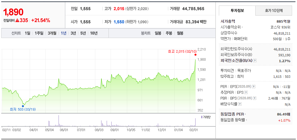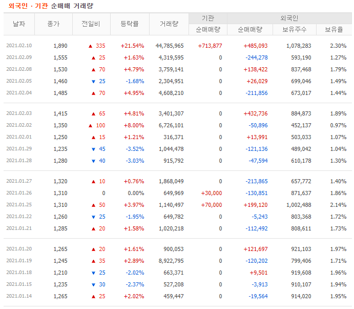 상보는 최근 한달간 1,265원에서 1,890원으로 장마감하며 625원이 올라 상승률 49.4%를 기록하였으며 평균거래량은 4,449,165주인데 2월 10일의 거래량을 보면 44,785,965주로 평균거래량의 10배이상 상승하였습니다.